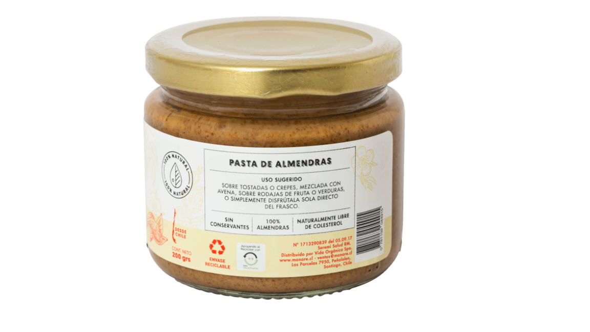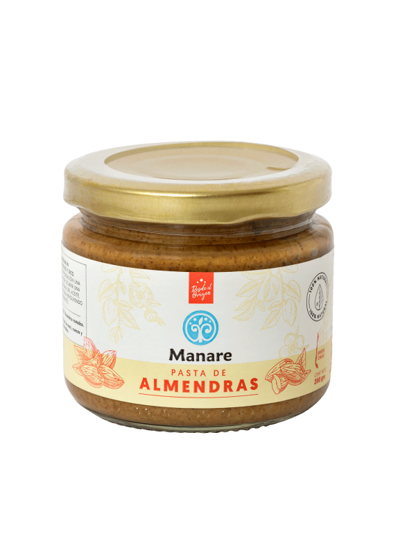 Mantequilla de almendras 100% natural, sin aditivos y sin sal ni azúcar añadidas.